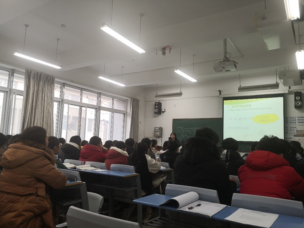 本次观摩课由任聪博士授课,讲授内容为“无机化学”中的缓冲溶液。任老师采用联系实践的方法,举例说明了缓冲溶液对于配位滴定和生物酶活性的重要性,引出缓冲溶液的作用原理。之后循序渐进地讲解缓冲溶液pH的计算和缓冲容量等内容,板书清晰有条理,重难点突出,例题规范,讲练结合,课堂气氛融洽活跃,收获了很好的教学效果。特别是讲解缓冲容量和缓冲范围时,使用缓冲容量的函数图形来进行解释,将枯燥的讲解转变为生动的传授,达到了可视化教学的效果,便于学生的理解,加深了学生的体会。
