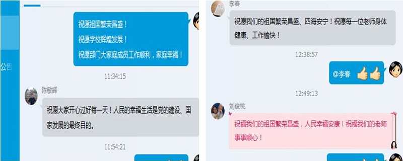有的老师认真措辞,有的老师将祝愿改了又改,一个个沉甸甸的祝福充满了正能量,表达了老师们对党、对祖国、对学校、对部门和对同事、事业的热爱,感人至深,也鼓足了大家奋发努力,干好本职工作报效祖国的热情和干劲!