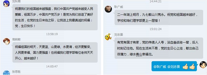 祝福活动中,很多群众教工甚至新入职的博士也积极参与,大家的祝愿有:“愿天更蓝、水更绿,祖国更繁荣!”“希望我们的党发展的原来越好!”“祝祖国越来越强大,愿大家越来越好!”“祝愿学校发展辉煌!”“撸起袖子跟党走,教学科研全都有!”等。