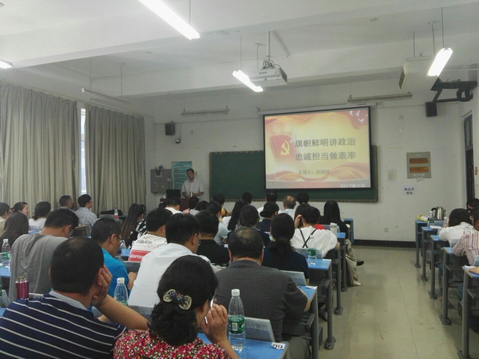 田主席从共产党员为什么要旗帜鲜明讲政治,到如何讲政治,思想上、政治上、行动上如何做都作了详细的论述;田主席还对我们共产党员如何对党忠诚,如何结合学校实际和教学本职工作做表率作了详细论述指导,要求共产党员一要在勤学习上作表率,二要在立德树人品德修养上做表率,三要推进学校融合上努力做表率,四要在提升教学科研上做表率,五要在敢于担当服务教学上做表率。田主席的党课深入浅出,理论联系实际,对全体教工来说也是一次难得的理论学习和师德师风教育课,让到课的党员、教工深受教益。