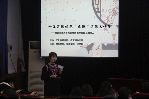 11月8日下午,由我校宣传部和文明办公室主办,物流电商学院、文法学院、williamhill英国三个党总支联合承办的“十佳道德模范”走进“道德讲堂”活动在英才校区E109成功举办。三部门教工和部分学生代表参加,物流电商学院张朦朦老师担任主持。