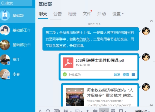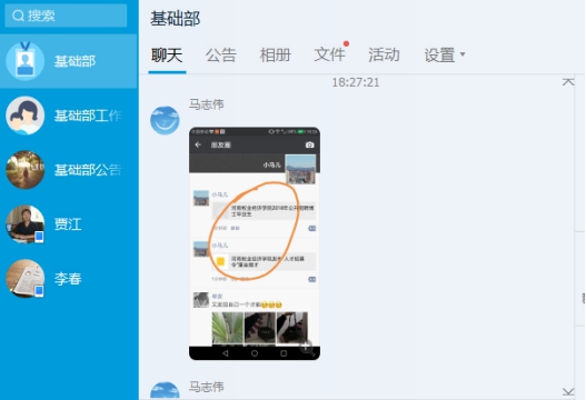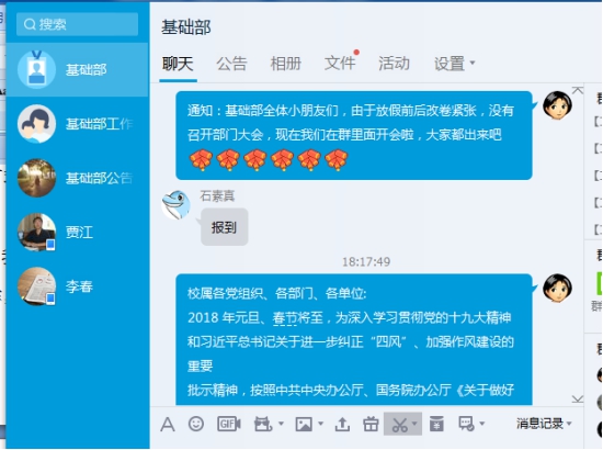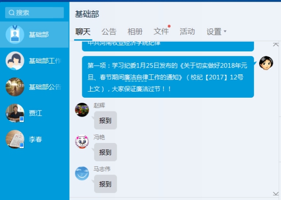 由于假前改卷忙,假后多校区不便,经班子商议,基础部于1月27日晚,在部门qq微信平台,热热闹闹招开教工大会,学习学校有关文件和通知精神,愉快讨论假期工作,做好四件大事:廉洁过节、全员招博、努力科研、孝道摄影等。微信大会由基础部总支书记赵白云组织。