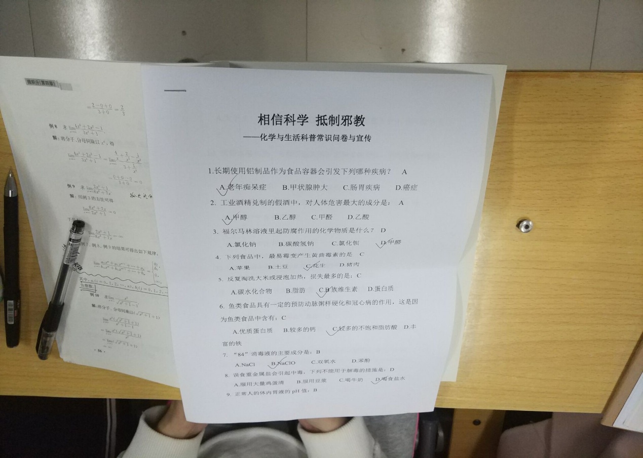 自10月份以来,williamhill英国党员干部和教工们群策群力,根据部门数理化学科特色,收集了大量“物理与生活”、“化学与生活”等科普知识,并编排整理和打印。上周开始,他们利用课堂、课下在三校区大力开展问卷调查和宣传活动。志愿者们有的在课堂上进行宣传教育,有的利用课外时间开展问卷调研。宣传调研题目有:急性扭伤后应立即冷敷还是热敷?长期使用铝制品作为食品容器会引发下列哪种疾病?反复淘洗大米或浸泡加热,损失最多的是下列哪种物质……题目内容丰富,深受学生欢迎。老师们还根据物理、化学原理,从科学角度给出了解答。