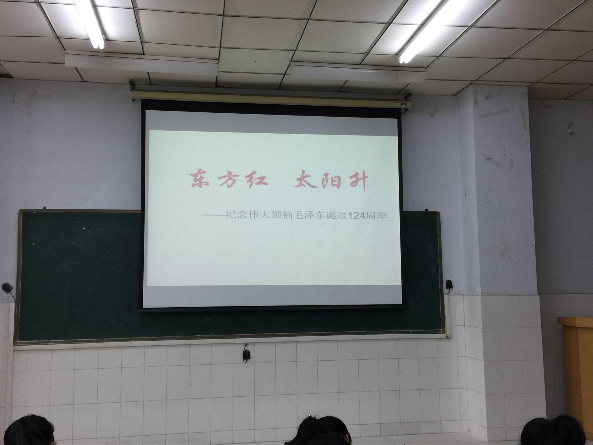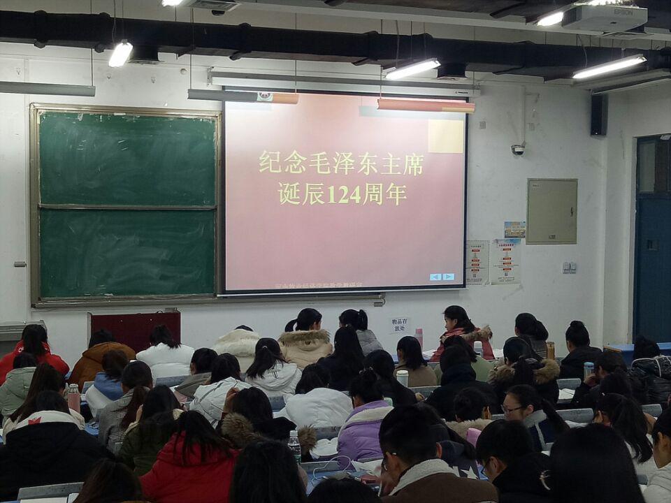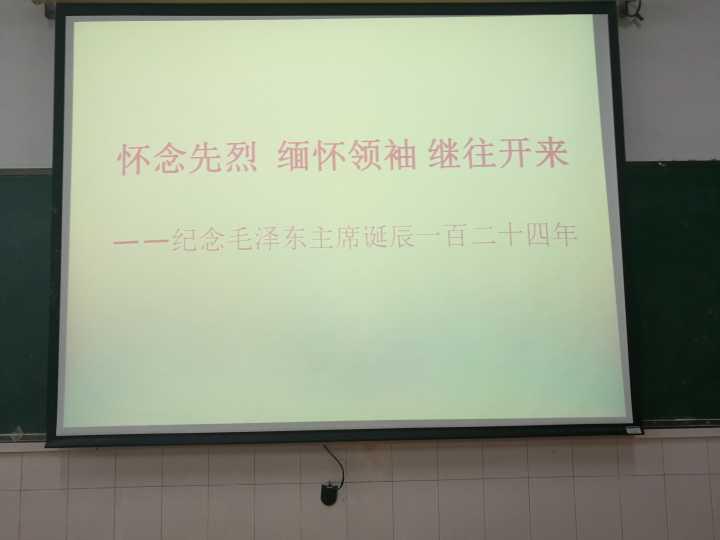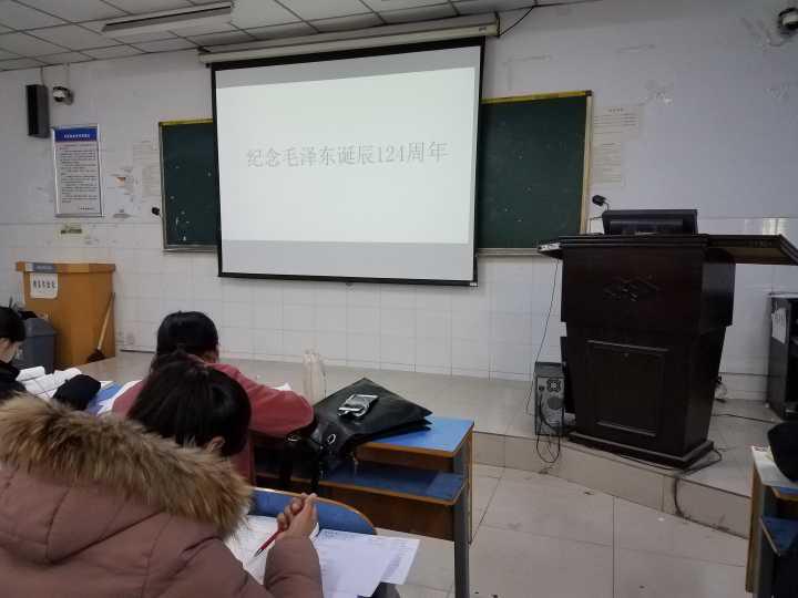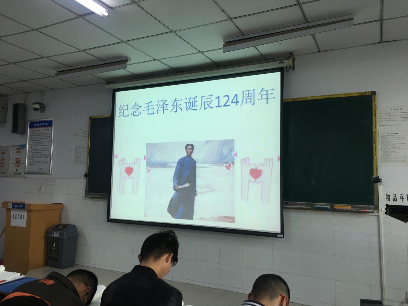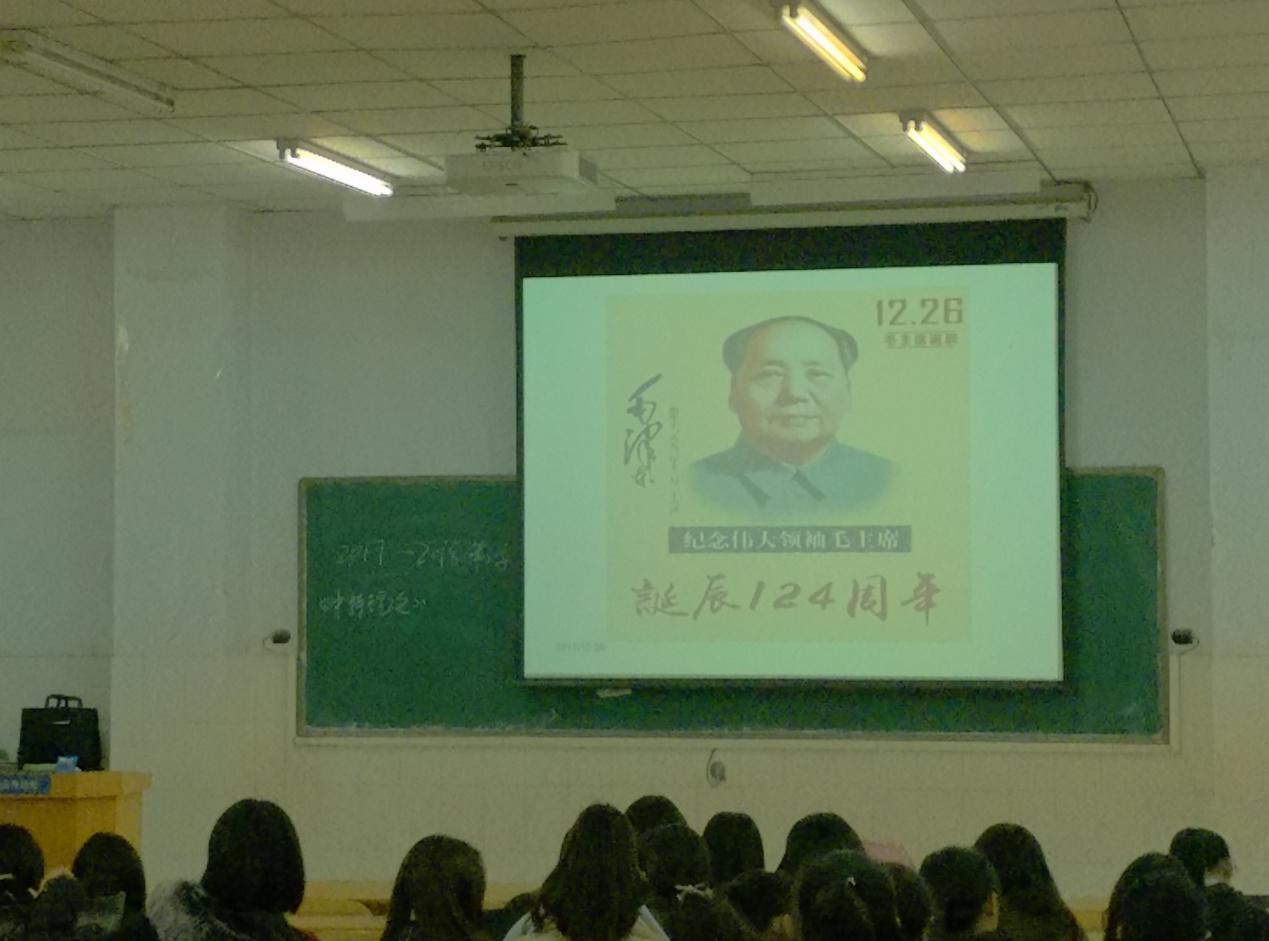 基础部利用课程多、合班大,每天上课班次多的优势,在12月26日毛泽东诞辰124周年当天,任课教师全体在课堂打出ppt“纪念毛泽东诞辰124周年”,弘扬民族精神。
