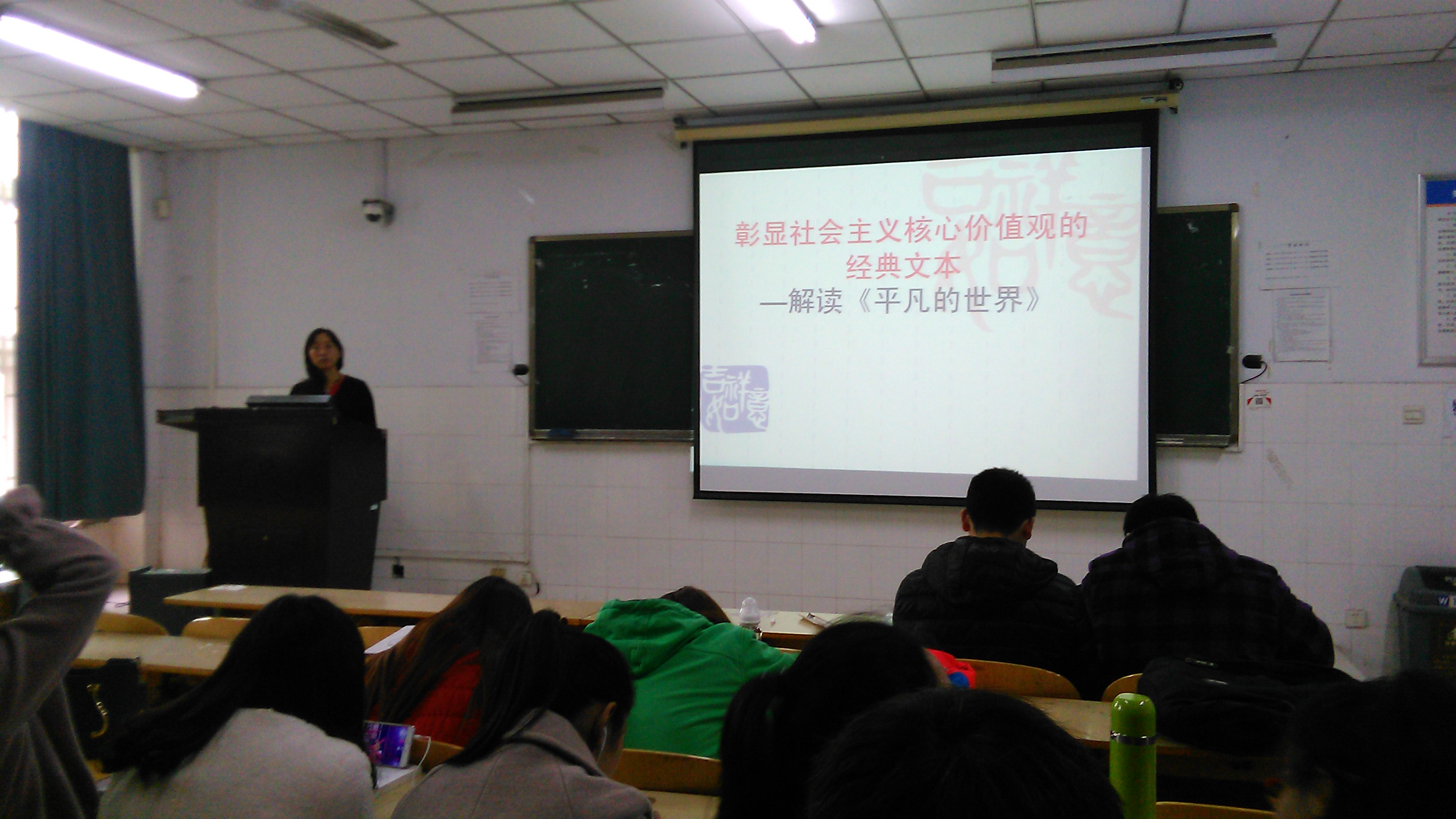 同一时间,在W107教室,大学语文教研室康新慧博士为工程管理学院的130名学生,举办了《彰显社会主义核心价值观的经典作品——解读路遥<平凡的世界>》的讲座。康老师在细读文本的基础上,明晰地解读了《平凡的世界》自问世以来,一直受到主流意识的推崇与赞誉的原因:是作品对苦难、艰辛生活的逼真描绘引发了读者的情感共鸣;作品对劳动、梦想的讴歌与赞美,对亲情、友情、爱情的热烈礼赞使得作品呈现出温暖、明亮的色调。成为一部既有着浓郁的现实主义底色、又高扬着理想主义的光辉,高度契合社会主义核心价值观的经典文本。此次讲座作为基础部本年度“大学生社会主义核心价值观的认同与教育”主题人文素质系列讲座的组成部分,旨在以欣赏文学作品为切入点,借助经典阅读进行社会主义核心价值观的渗透教育,切实提高学生的知识文化素养和思想道德水平,收到了很好的效果。