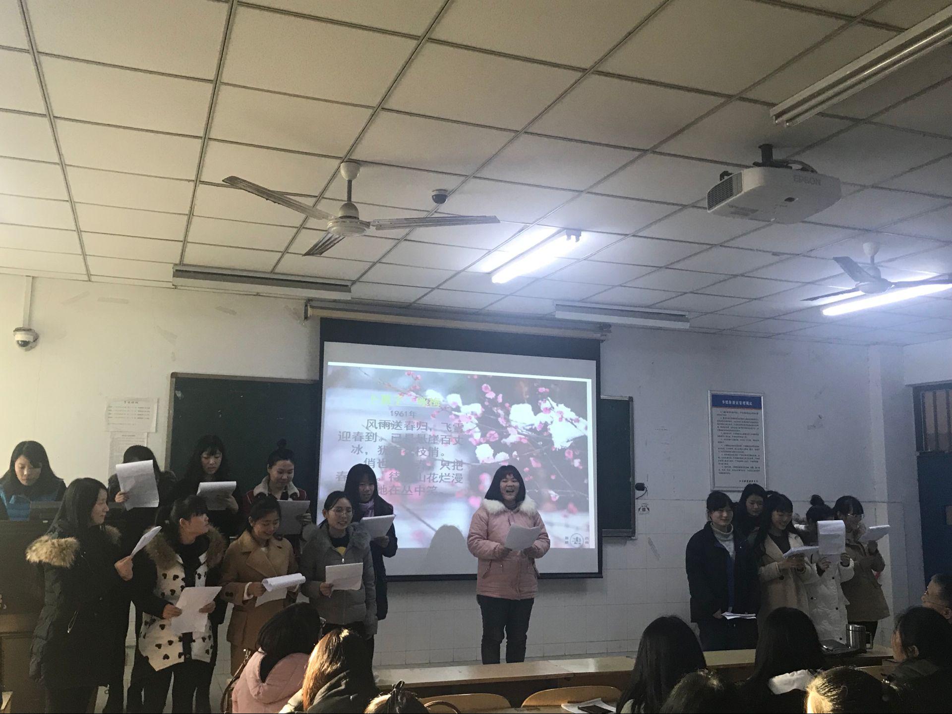 主办部门基础部、图书馆高度重视,图书馆党总支书记李君玲参加了本次活动,图书馆馆长魏秀娟对毛泽东诗词的经典篇章进行了鉴赏和激情朗诵,使英才校区诵读活动呈现了更高水平。基础部全体教师和百余名学生共聚一堂,有单人诵读、双人诵读、小组诵读等形式多样。基础部全体教工的集体诵读又一次将现场气氛推向了高潮。