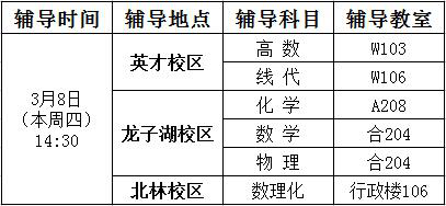 新学期开学补考在即,鉴于学生复习困难,基础部定于本周四下午在三校区同时进行“数理化”补考前义务辅导。具体辅导时间地点如下。