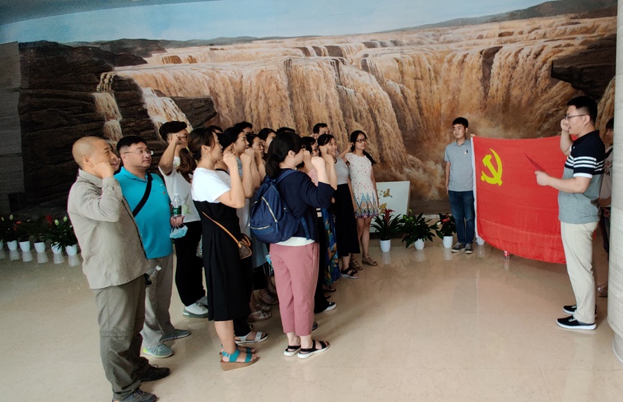 来到黄河博物馆序厅,站在壶口瀑布大型浮雕前,在党总支书记郝景昊领誓下,全体党员举起右拳,面对党旗重温入党誓词,庄严宣誓。随后,大家依次参观了流域地理、民族摇篮、千秋治河、治河新篇、和谐之路五个展厅。