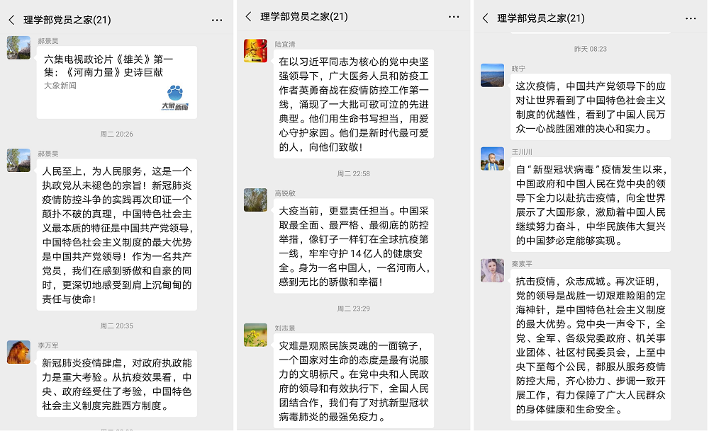 自5月11日《雄关》开播以来,williamhill英国全体党员同志通过多种形式观看学习,并积极交流心得体会。大家激情昂扬,纷纷表态:通过观看学习该政论片,心潮澎湃、充满力量;不仅感受到了中国共产党领导和社会主义制度、国家治理体系的强大生命力和显著优越性;而且在骄傲和自豪的同时,也深感肩上的责任重大。大家一致认为,要紧密联系思想实际和工作实际,把学习观看《雄关》与深入学习贯彻新冠肺炎疫情发生以来习近平总书记发表的重要讲话结合起来,与做好当前各项工作尤其是与本科教学合格评估和落实学校第一次党代会精神结合起来,凝心聚力抗击疫情,扎实推进各项工作,为部门和学校发展贡献力量!