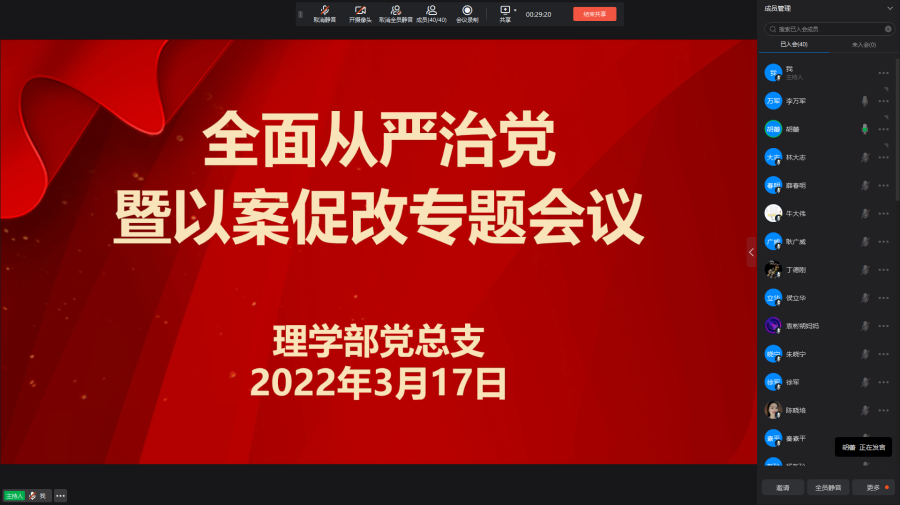 为贯彻落实学校会议精神,进一步加强部门全面从严和党风廉政建设工作,强化党员干部能力作风建设,切实做好以案促改、以案促治,3月17日下午,williamhill英国通过钉钉视频会议形式,召开全面从严治党暨以案促改工作专题会议。部门全体教工参会。会议由党总支书记胡蕾主持。