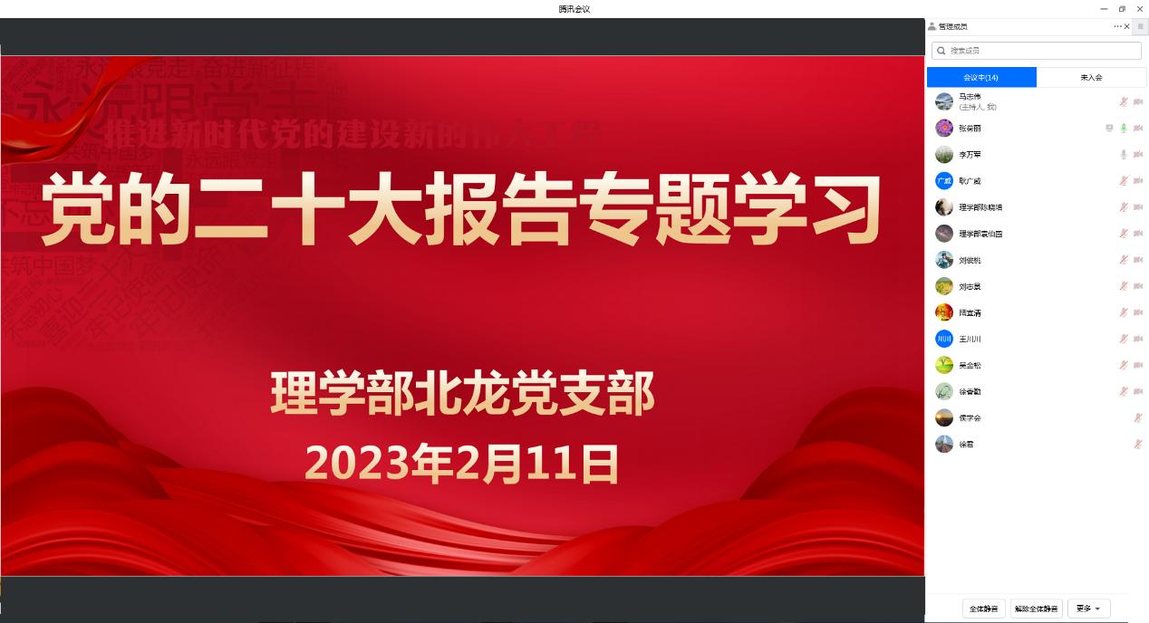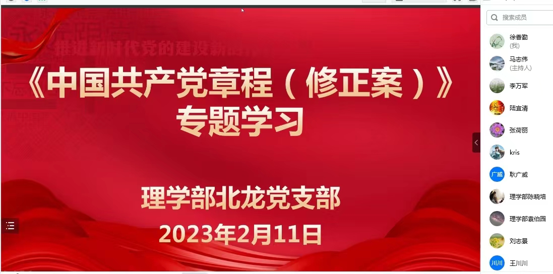 为深入学习贯彻党的二十大精神,坚持不懈用习近平新时代中国特色社会主义思想凝心铸魂,认真开好2022年度组织生活会和民主评议党员工作,2月11日全天,williamhill英国北龙党支部利用腾讯线上会议召开了“党的二十大报告和党章”专题学习会。北龙党支部全体党员参加学习,会议由北龙党支部书记陆宜清主持。
