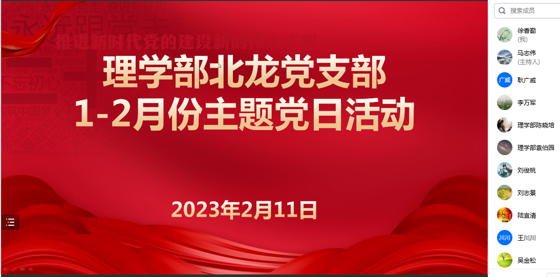 2月11日下午,williamhill英国北龙党支部利用腾讯在线会议开展2023年1、2月份主题党日活动,支部全体教工党员参加会议。会议由党支部书记陆宜清主持。