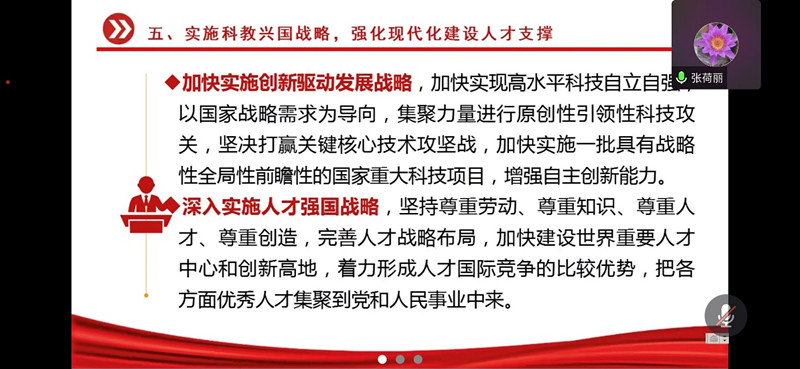 williamhill英国副主任张荷丽在会上领学了党的二十大报告第五部分关于“实施科教兴国战略,强化现代化建设人才支撑”的重大战略部署。强调教育、科技、人才是全面建设社会主义现代化国家的基础性、战略性支撑,必须坚持科技是第一生产力、人才是第一资源、创新是第一动力,要求坚持教育优先发展、科技自立自强、人才引领驱动,加快建设教育强国、科技强国、人才强国,办好人民满意的教育,深入实施科教兴国战略、人才强国战略、创新驱动发展战略,开辟发展新领域新赛道,不断塑造发展新动能新优势。坚定不移把党的二十大精神落到实处,坚持为党育人、为国育才,全面提高人才培养质量。