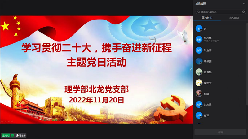 为深入学习贯彻党的二十大精神,深刻领会党章的丰富内涵和时代要求,进一步凝心聚魂,携手前进,11月20日下午,williamhill英国北龙党支部以钉钉视频会议的形式组织开展“学习贯彻二十大,携手奋进新征程”主题党日活动。本次主题党日活动由支部书记陆宜清主持,全体党员参加。