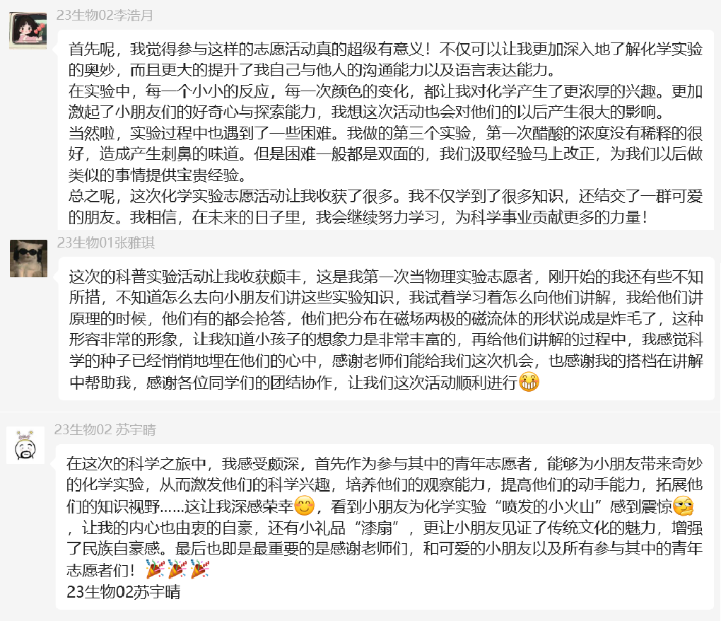 探索科学,启迪成长。此次志愿服务活动不仅引导少年儿童发现生活中的科学之美,感知科学世界的奥秘与精彩,点亮好奇心,启发科学志;同时,也引导青年学子学以致用、用以促学,把志愿服务融入课程教育和课外实践,在服务他人、奉献社会中收获满满的成就感、价值感,充分发挥了基础课程的育人功能。