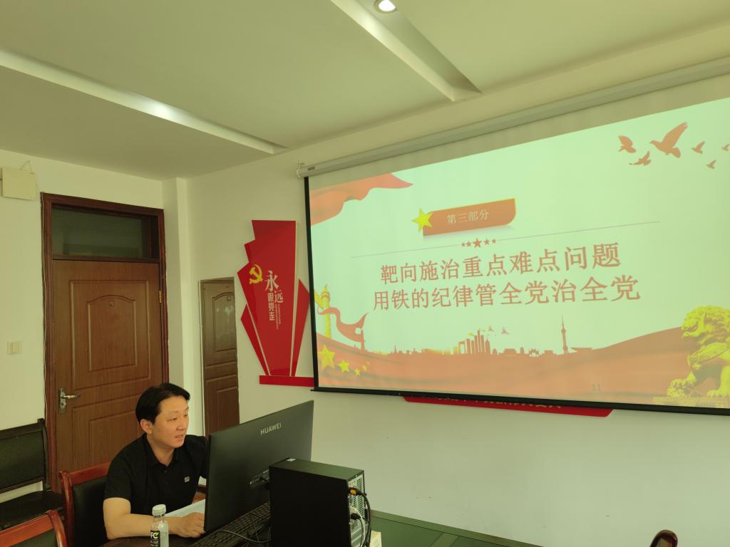 首先,赵辉以《<学条例守党纪>—始终坚持严的基调 全面加强纪律建设》为题,从重要意义、重点难点问题、经验总结等多个方面详细讲解了《中国共产党纪律处分条例》(以下简称《条例》)。通过专题党课,党员同志们更加深刻的认识到,十八大以来,党中央着眼解决大党独有难题、健全全面从严治党体系,三次修订《条例》,始终坚持严的基调,不断完善纪律规矩,释放了全面从严治党越来越严、越往后执纪越严的强烈信号,充分彰显了我们党推进自我革命的坚定决心和坚强意志;《条例》赋予了制度与时俱进的生命力,有利于充分发挥纪律建设标本兼治的利器作用。