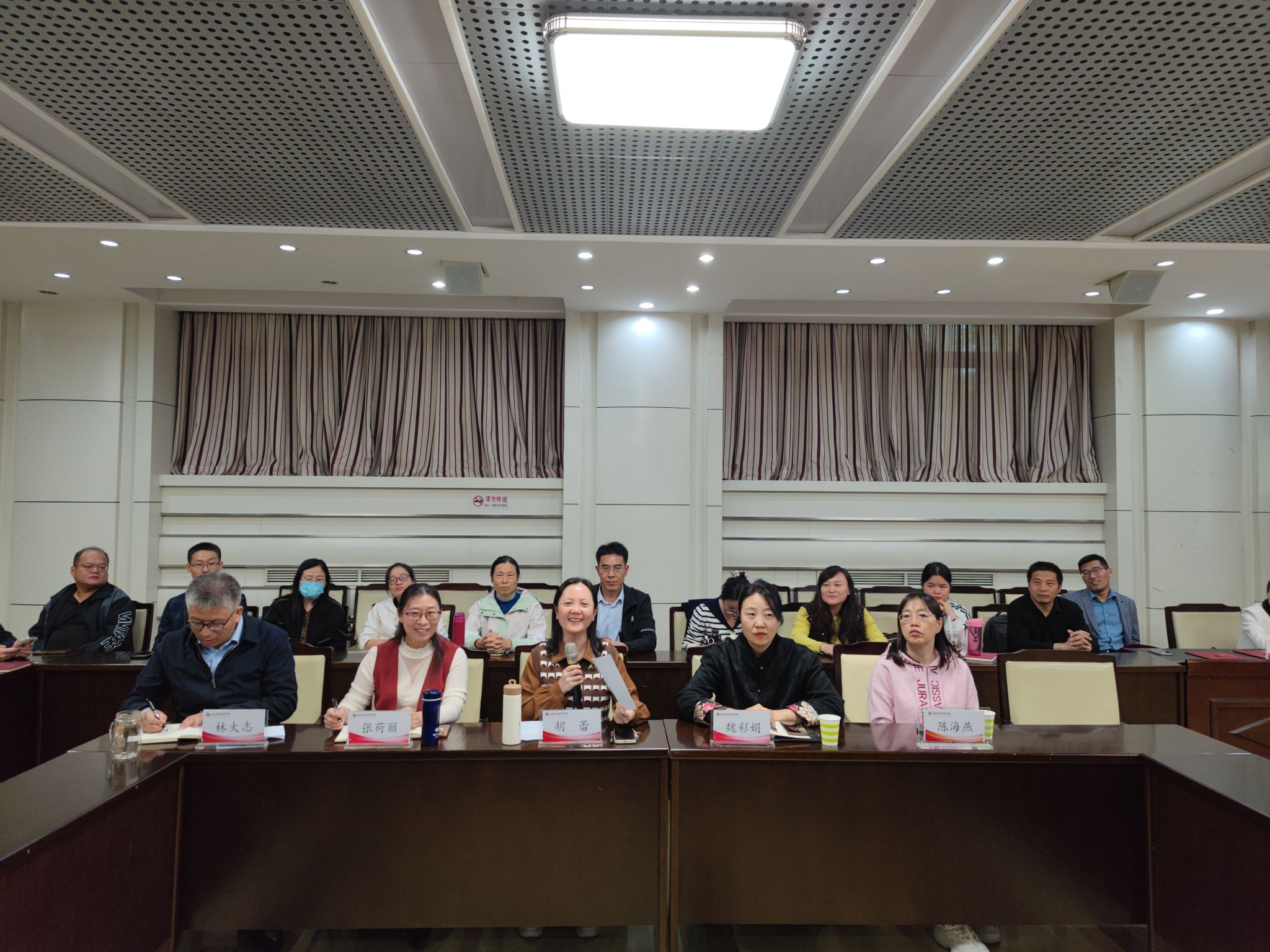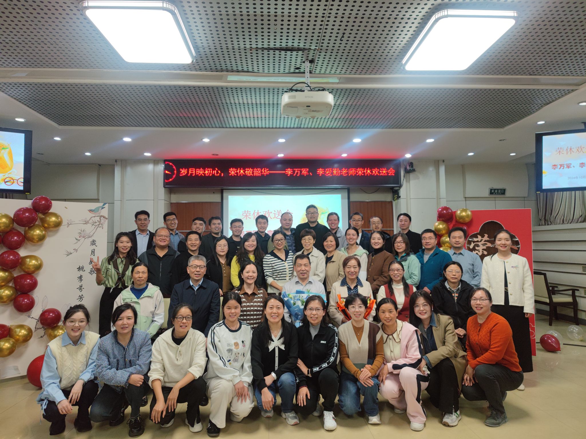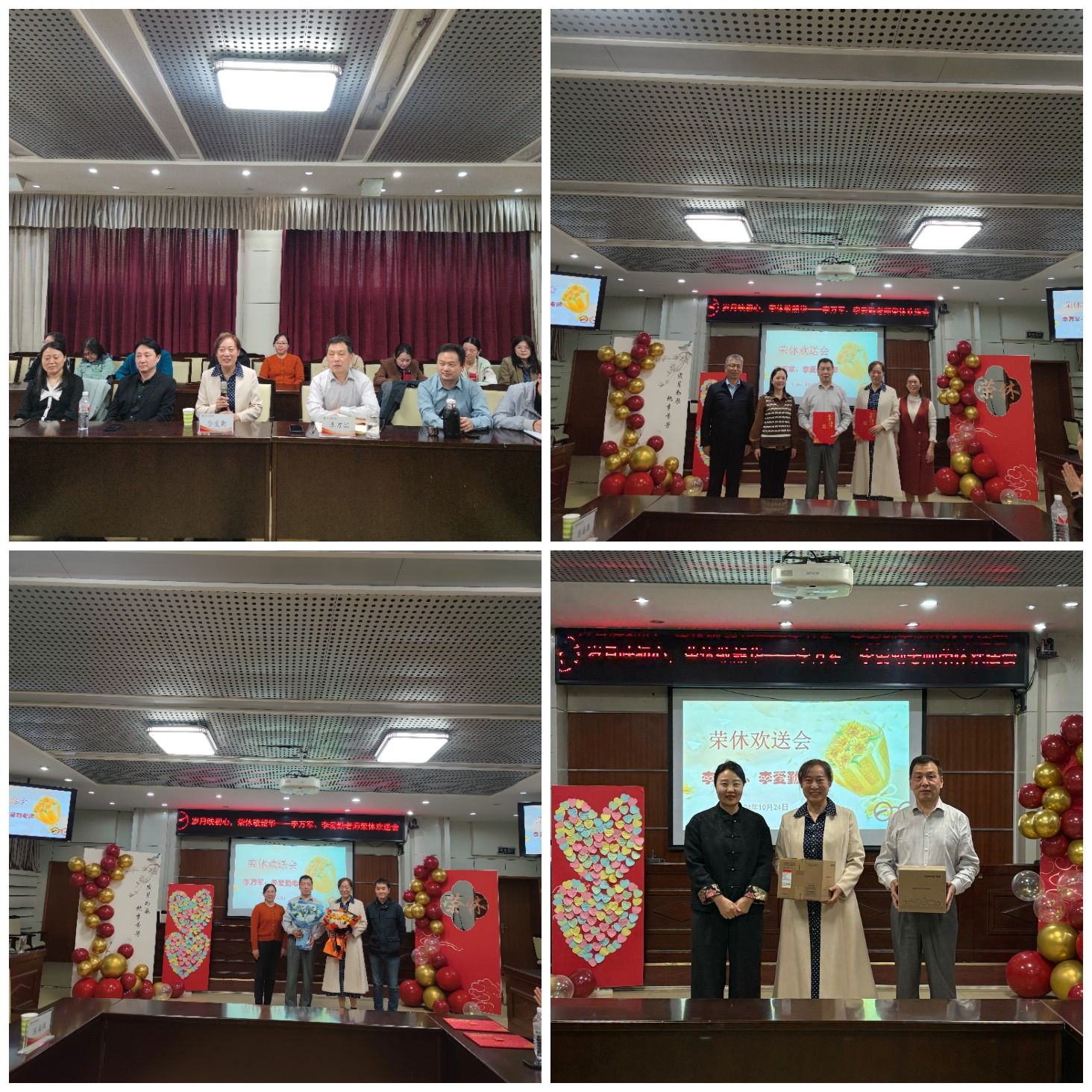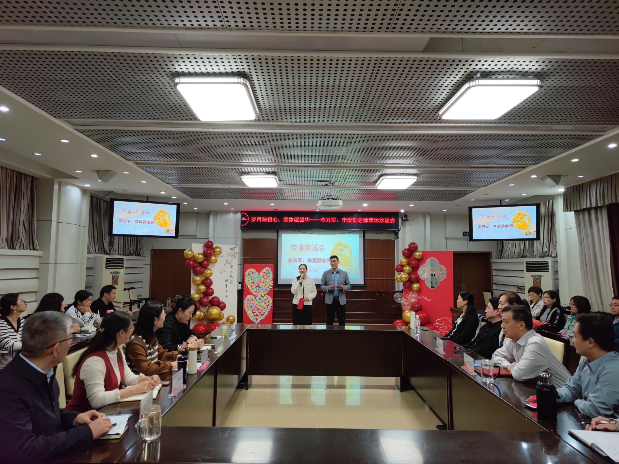 魏彩娟副处长祝贺两位教师光荣退休并代表离退处送上心意与祝福。教师代表们发表感言,大家一起观看了部门精心制作的《岁月如歌》视频、照片PPT,伴随着赵治杰老师原创诗《念奴娇˙荣休会》的温馨诵读声,部门全体教师共同为两位荣休教师献唱了送别歌曲《友谊地久天长》。