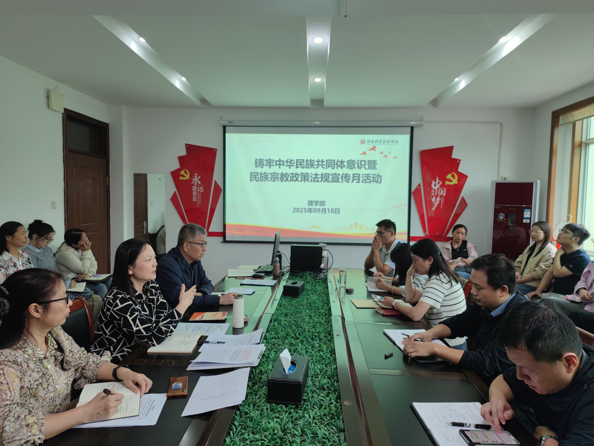 胡蕾重点传达了学校《关于开展铸牢中华民族共同体意识暨民族宗教政策法规宣传月活动的通知》文件精神。她指出,铸牢中华民族共同体意识是维护国家统一和民族团结的思想根基,是新时代党的民族工作的主线,全体教职工要深刻领会、准确把握,将铸牢中华民族共同体意识教育融入教育教学、科学研究和管理服务全过程,引导青年学生牢固树立休戚与共、荣辱与共、生死与共、命运与共的共同体理念,自觉维护民族团结与社会稳定。