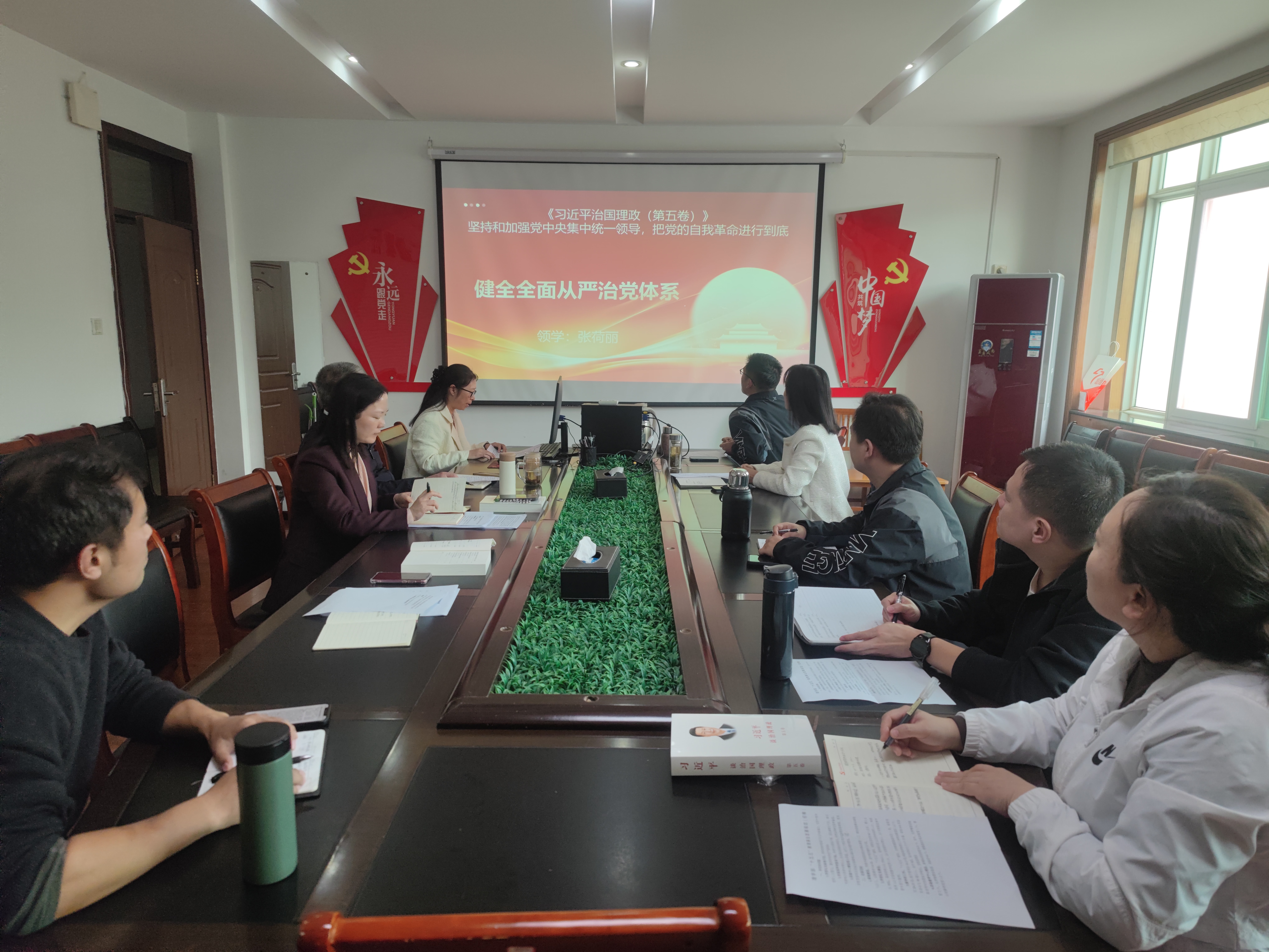 会上胡蕾解读了《习近平谈治国理政》第五卷的整体框架和核心要义。党总支纪检委员、副主任张荷丽原文领学了《习近平谈治国理政》第五卷中《进一步健全全面从严治党体系,开辟百年大党自我革命新境界》等章节。