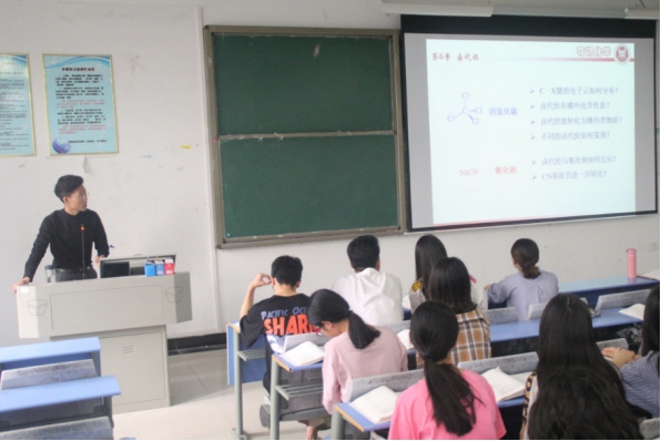 马志伟老师授课的班级是17食品质量01、02班,讲授课程为《有机化学》,他本次授课主要内容是卤代烷烃的化学性质,重点讲述卤代烷烃的亲核取代反应。课上,首先是10分钟左右的生活中化学知识的分享,由两小组同学将课下所准备的内容向大家进行汇报分享,马老师进行了点评和补充。接下来,马老师根据两个小组所讲内容与新课的联系,过渡到本次课的讲授--卤代烷烃的亲核取代反应。课堂上,马老师重视学生思维的启发、积极性的调动,课堂气氛活跃,收到了良好的效果。