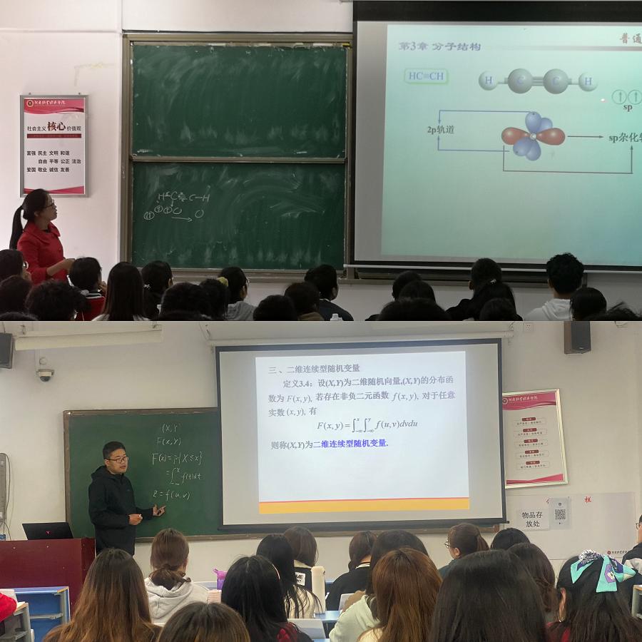 本次研讨型观摩课由化学教研室刘俊桃老师和高等数学教研室的薛春明老师主讲,交流型观摩课由袁伯园、杨永、耿广威、郭小飞等年轻老师参与。在整个观摩课过程中,老师们图文并茂、引入动画,将复杂的过程可视化,并注重学生的知识迁移能力,鼓励学生要勇于发现问题解决问题。整个课堂逻辑严密,语言准确,教学过程安排合理,课堂节奏把握恰当,同时自然合理地把课程思政元素有机融入教学。