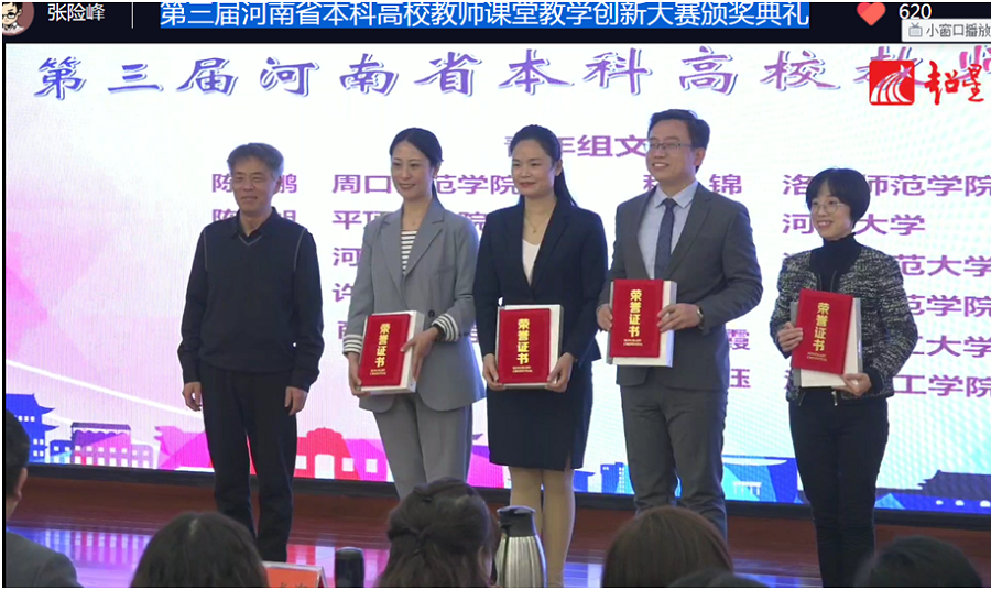 河南省教学创新大赛旨在聚焦教学创新、推动教学革命,不断提高教师教学创新能力,打造高校教学改革的风向标。自大赛启动以来,教务处、williamhill英国高度重视,多次组织对任聪老师的参赛内容进行指导和打磨。在竞争十分激烈的情况下,任聪老师一路通过省级复赛,挺进省级决赛。在决赛中通过5分钟的教学阐释和15分钟的精彩授课,最终获得特等奖,展示了我校青年教师的教学创新能力,为学校和部门赢得了荣誉。