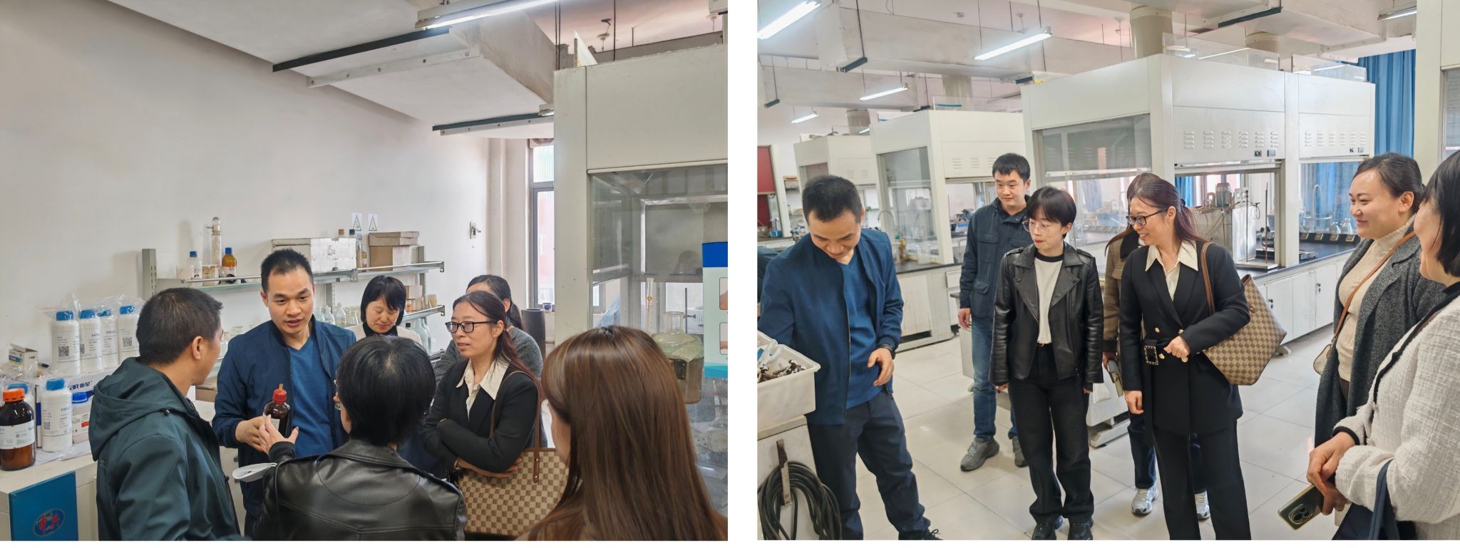 座谈会上,双方重点就实验课程建设展开交流。蒋玲、孙淑敏两位老师详细介绍了《无机及分析化学》《有机化学》等实验课程的教学安排、线上资源开发及创新性实验设计经验,并分享了实验教学全流程管理的具体举措,包括课前预习考核、课中操作指导、实验报告批改标准及考核评价指标体系。针对实验教材选用、实验报告规范(统一报告册与预习本结合模式)等细节问题,双方进行了充分讨论。现场展示了化学系在多年教学中积累的实验项目创新实践成果,为我校教师拓宽教改思路提供了可借鉴的范例。