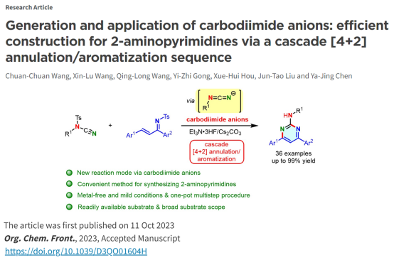 碳二亚胺在有机化学领域具有广泛的应用,其参与的各类环化反应为氮杂环化合物的合成提供了高效的策略。王川川博士首次提出并证实了碳二亚胺阴离子的存在,极大地扩大了碳二亚胺的应用范围。这是国际上关于N-Ts氰胺选择性经碳二亚胺阴离子参与反应的首次报道,是继利用N-Ts氰胺合成五元环胍化合物(Org. Chem. Front. 2022. 9, 1574-1579;J. Org. Chem. 2021, 86, 3546-3554)之后,在围绕N-Ts氰胺参与的环加成反应研究领域取得的又一重大突破。该成果也得到了国际同行们的高度认可和肯定。王川川博士的研究得到了国家自然科学基金、河南省科技攻关项目、河南省高等学校重点科研项目及William威廉英国创新基金等项目的支持。