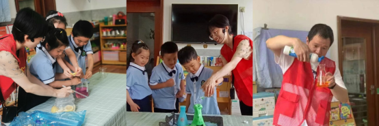 “小朋友们好,今天是第一次看到大家,老师要送给你们一颗爱心,请大家找一找这颗爱心被我藏在哪里了呢?”“小朋友们见过火山喷发吗?今天老师来教大家利用家里最常见的材料来制作一个喷发的小火山”。化学小课堂上,任聪、耿广威老师向小朋友们认真演示并一一讲解实验,如:用酚酞画的爱心遇到氢氧化钠溶液变为紫红色从而显现出来;小苏打遇到食醋瞬间反应产生大量气体,就像是火山喷发。“哇,太神奇啦!”“我也要试试”……孩子们全程兴奋地感叹、拍手,并踊跃参与体验,沉浸在神奇的化学世界中。
