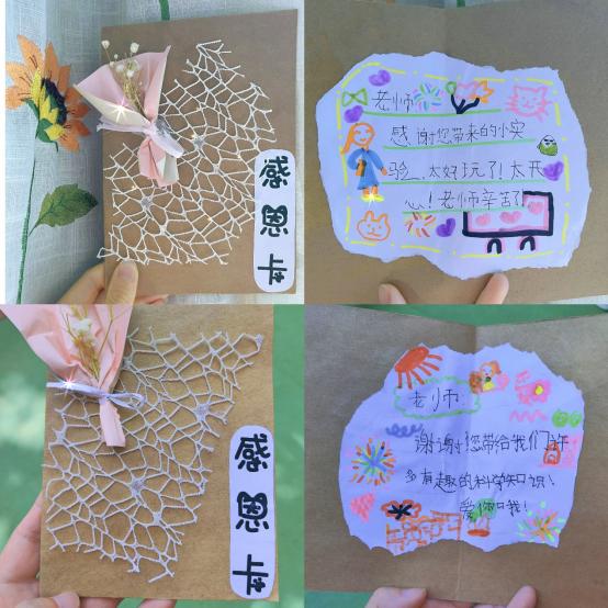 一个多小时的科学小课堂很快结束了,孩子们都意犹未尽,志愿服务队员们收获了满满的成就感、价值感,任聪、赵治杰两位主讲老师还收到了小朋友们亲手制作的感恩卡,他们激动地感叹,志愿服务既是"助人",亦是"自助",既是"乐人",同时也"乐己"。幼儿园的郭园长一再表示,“科普在你身边”志愿服务活动点亮了孩子们对科学探索的好奇心,启发了孩子们的思维能力,在他们心中播种下了科学的种子,希望这样的科学小课堂能多多开展!