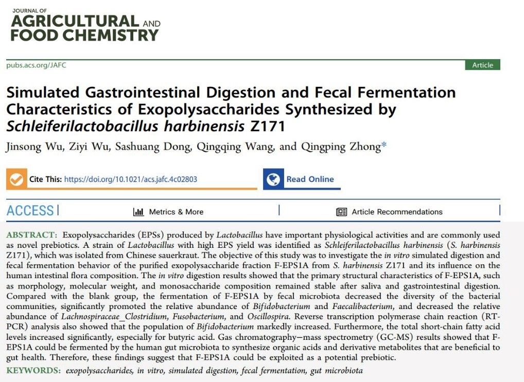 日前,williamhill英国吴金松博士在中科院一区Top期刊《Journal of Agricultural and Food Chemistry》(影响因子5.7)发表了题为“Simulated gastrointestinal digestion and fecal fermentation characteristics of exopolysaccharide synthetized by Schleiferilactobacillus harbinensis Z171”的研究论文,该论文得到了国家自然科学基金和广东省基础与应用基础研究基金等项目的资助。