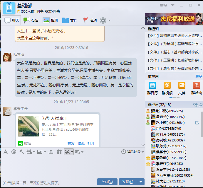 本次“传播正能量”微文征集与转发活动是通过部门qq群进行的。转发过程激动人心,每天晚上部门qq群中讨论热闹非凡。有童岩老师转发的充满感恩的个人日记,有陈敏辉转发的“红军长征精神激发新时代中国奋进”的呐喊,高锐敏的“走好我们这一代人的长征路”、付利芳的“习近平:不忘初心继续前进”等,都彰显着时代的最强音,激励人们继续奋斗。耿芳芳的“生活的意义是什么”引导人们对人生进行积极思考,侯立华的“10个经济学原理概括人生所有大道理”让人们在了解经济学原理的同时,也提升了思考问题的能力。