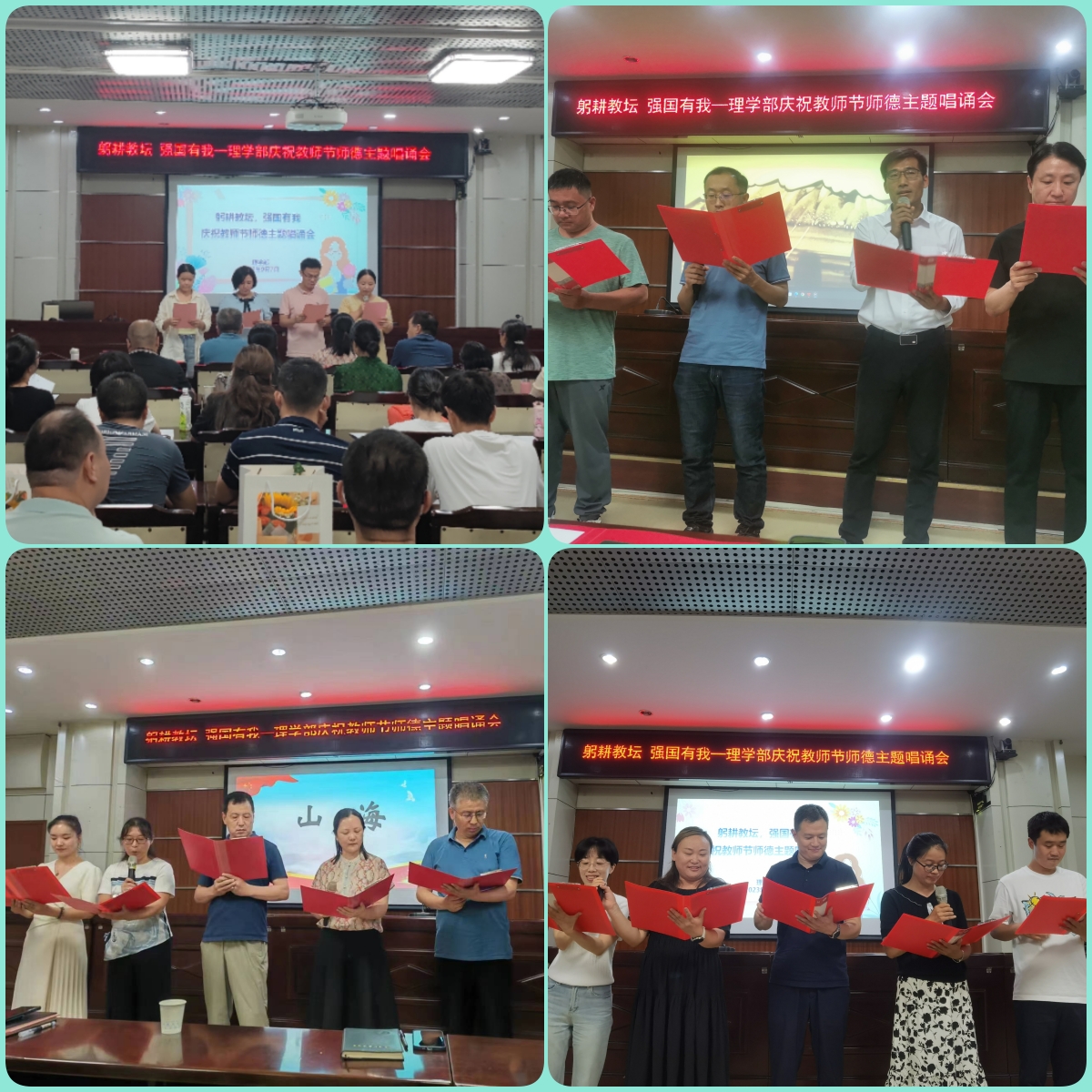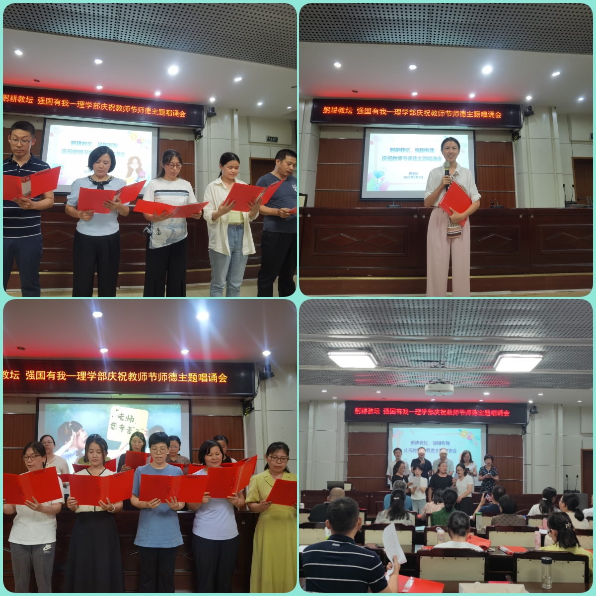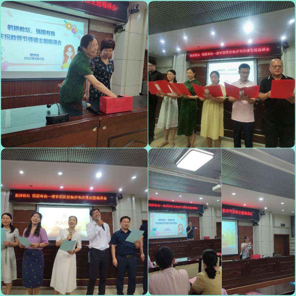 唱诵会以四位新进教师共同宣读《新时代高校教师职业行为十项准则》拉开帷幕。全体教职工紧紧围绕师德师风这一主题,结合自身工作和身边的感人事迹,以丰富的内容、真挚的情感,唱诵出自己对师德的感悟和思考。《山海》的激情澎湃,《因为是老师》的娓娓道来,《载着使命前行》的高亢激昂,《我是一名人民教师》的春风化雨......伴随着优美的旋律,老师们用最深厚的感情、最嘹亮的声音表达着爱与责任,抒发着对岗位的执着、对教学的热爱和对教育的初心和使命。活动现场气氛热烈,掌声阵阵,欢乐融融,现场精心准备的花束和穿插其中的抽奖环节更让老师们充分感受了属于自己节日的快乐和欣喜。活动最后,全体教职工齐声高唱《我和我的祖国》,将本次师德主题唱诵会推向了高潮。